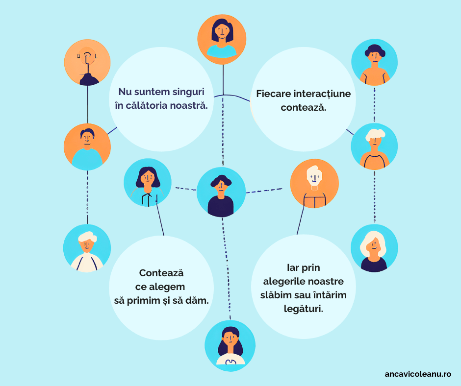 Nu știu dacă v-ați gândit la asta, dar noi relaționăm în orice moment al zilei, chiar și când e vorba despre lucruri simple. Fie că gândim ceva, că mergem la cumpărături, că scriem un email, că pregătim masa, că facem duș sau că dăm un „like” – cam tot ce facem este în raport cu cineva (acel cineva fiind uneori „doar” noi înșine). Iar viața se compune din toate aceste momente mici și din gesturile și oamenii care ne înconjoară sau cu care alegem să ne înconjurăm.